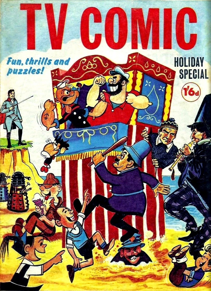 TV Comic was a long running (1951 to 1984) British weekly anthology which, as the title implies, carried a number of licensed strips related to popular TV shows of the day. This led to it having a very eclectic mix of characters within. Most of the time one or other character got to be the cover feature, but when it came to the frequent holiday specials common to British comics of the era they tended to try and promote sales by showing as many of the characters within as possible, leading to some interesting covers.